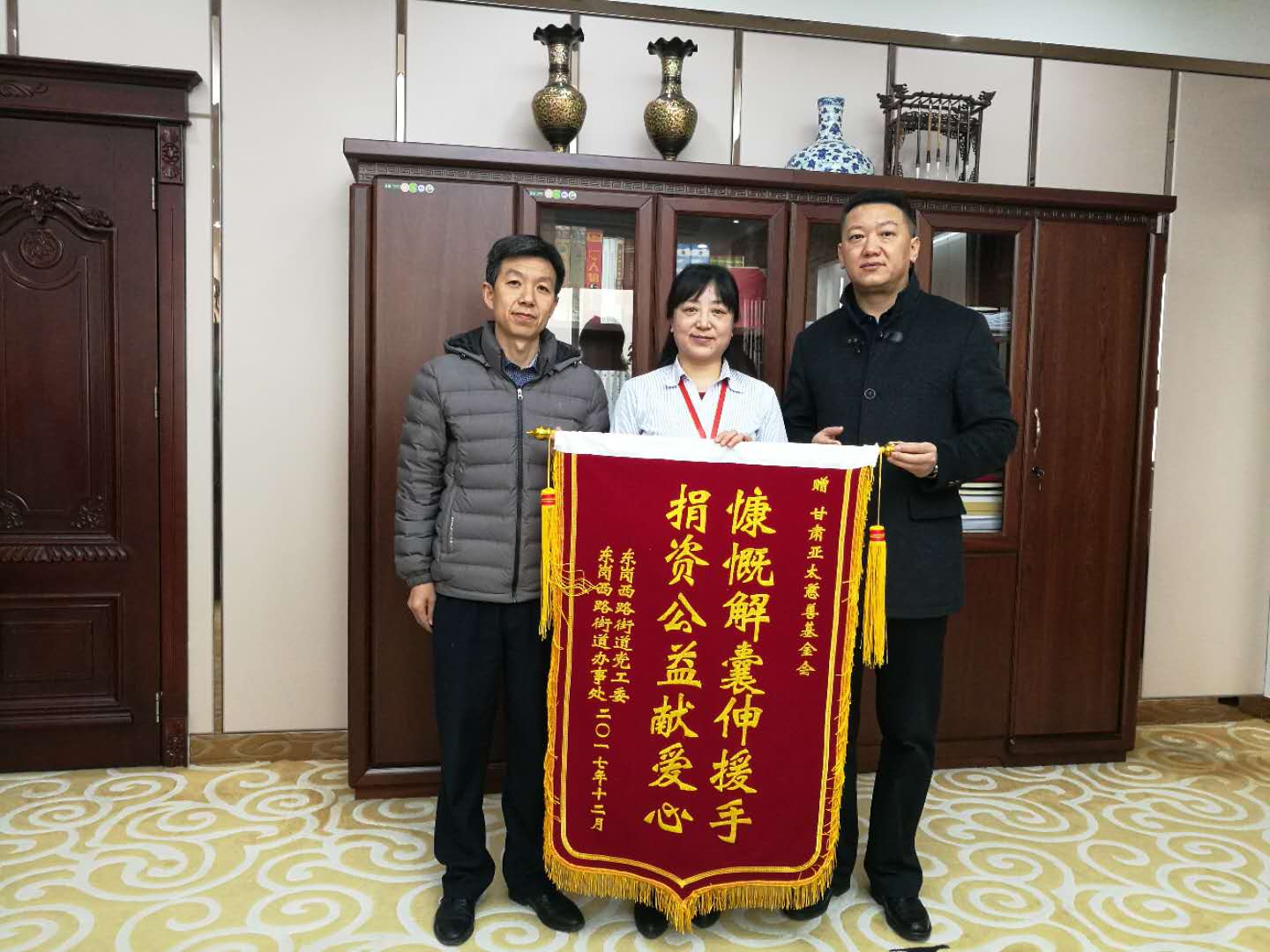 2018年元月3日上午,冒着2018年兰州第一场瑞雪,兰州城关区东岗西路党工委相关向导一行,来到兰州esball集团西关十字esball名苑办公楼,向兰州esball集团向导送来锦旗,体现谢谢甘肃esball慈善基金会慷慨解囊伸援手捐资公益献爱心之善举,和兰州esball集团支持社区下层事情,转达社区温情,向东岗西路街道服务地方有网格员捐助数万元元人民币购置御寒棉衣的慈善公益善举。